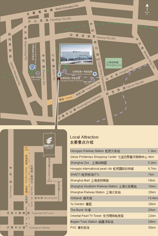 The Shanghai Hongqiao Airport Hotel (Air China Limited) is located inside the Terminal 2 of Hongqiao International Airport. It's the only luxurious hotel which provides exclusive boarding channel at the lobby in China. A corridor is connected directly to the terminal building. Please process check-in at least 30 minutes in advance. The hotel location is richly endowed by nature, enjoy the convenience of Hongqiao business district, nearby Shanghai Hongqiao Railway Station, Shanghai International Exhibition Centre, THE HUB (Opened in 2014). Business guests may get to airport, railway station on feet, and save guests' precious time by reaching most big cities in China, taking airplanes or high-speed rails. Add: No.181, Shen Da San Road, Hongqiao Airport, Shanghai, China